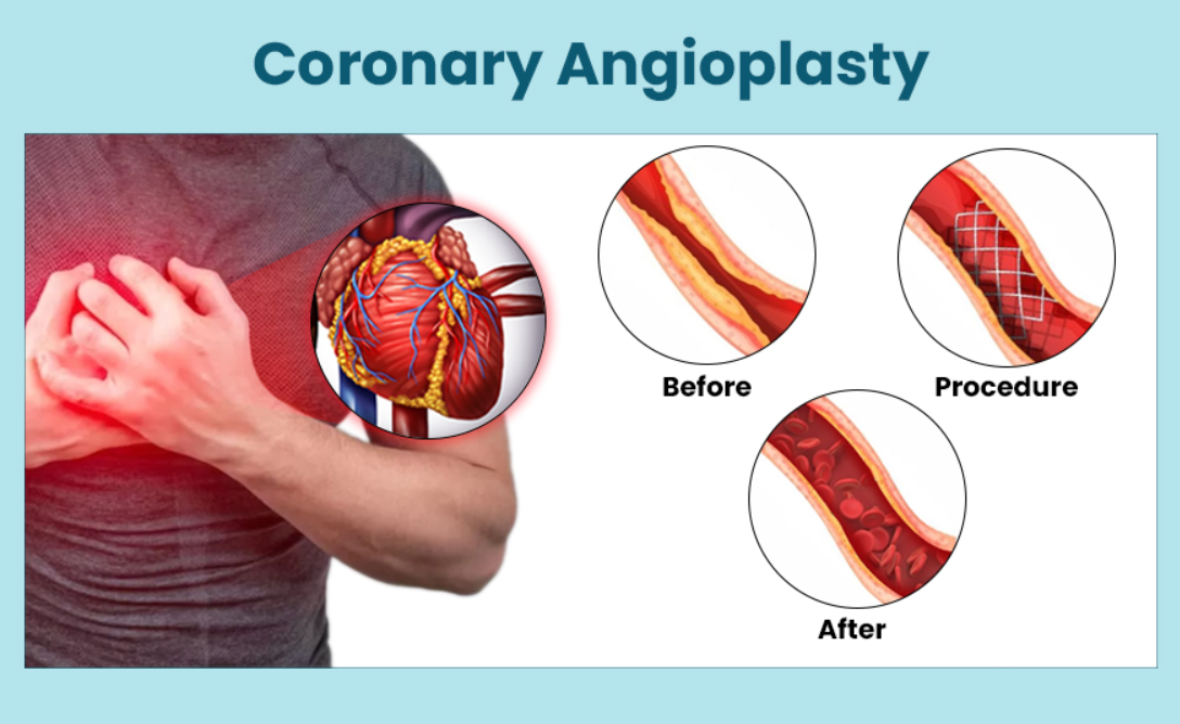 Coronary angioplasty, also known as percutaneous coronary intervention (PCI), is a medical procedure used to open narrowed or blocked coronary arteries — the blood vessels that supply blood to the heart muscle. This condition is typically caused by atherosclerosis, where plaque (fatty deposits) builds up inside the arteries, obstructing blood flow.