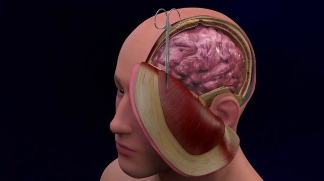 Dura mater (outer brain membrane) is opened and sometimes expanded using a dural graft.