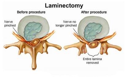 Lumbar laminectomy (lower back) — most common, for leg symptoms and walking difficulty.