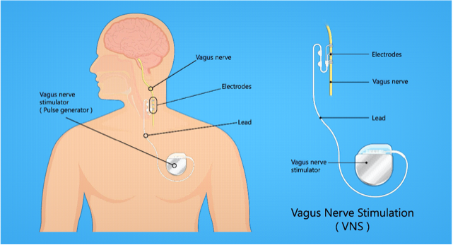 Vagus Nerve Stimulation (VNS) is a medical treatment that uses mild electrical impulses to stimulate the vagus nerve, a key nerve that connects the brain to various organs in the body. A small device, similar to a pacemaker, is implanted under the skin in the chest and connected to the left vagus nerve in the neck. VNS is mainly used to treat epilepsy, treatment-resistant depression, and certain neurological or inflammatory conditions.