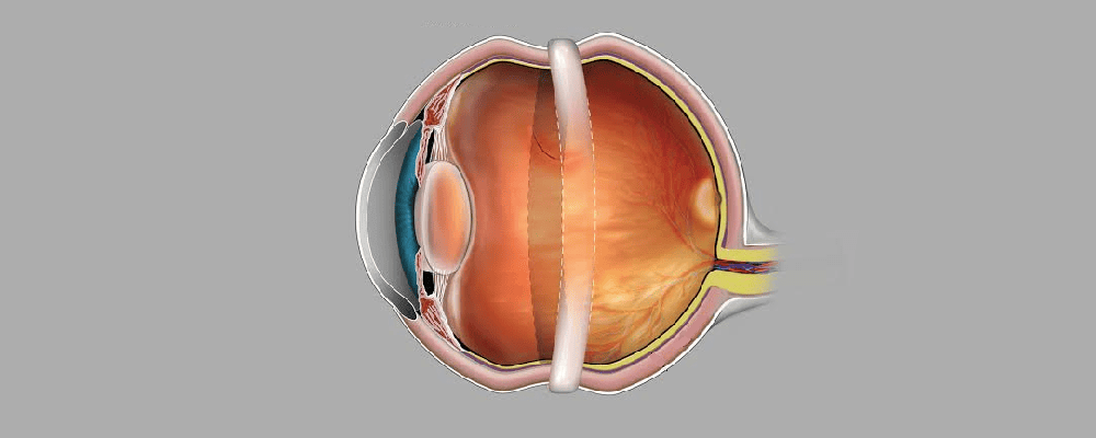 A silicone band or sponge is sutured to the sclera around the equator of the eyeball.