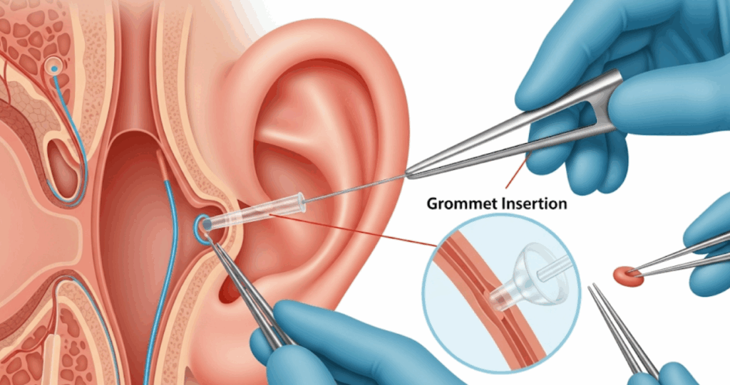 Grommet insertion is a short and safe procedure, usually performed under general anesthesia for children and local anesthesia for adults. The surgeon makes a tiny incision in the eardrum (myringotomy), gently removes any fluid from the middle ear using suction, and places the grommet into the incision. The entire process typically takes 10 to 20 minutes.