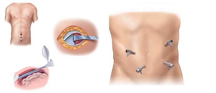 Several small incisions are made in the abdomen for a laparoscope and surgical instruments.
